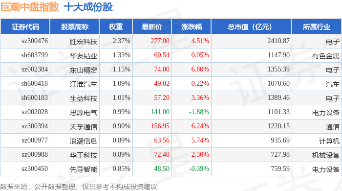 证券之星消息,11月26日,巨潮中盘(399315)指数报收于4458.88点,涨0.31%,成交2085.26亿元,换手率1.05%。当日该指数成份股中,上涨的有121家,迈为股份以12.75%的涨幅领涨,下跌的有169家,国博电子以6.27%的跌幅领跌。