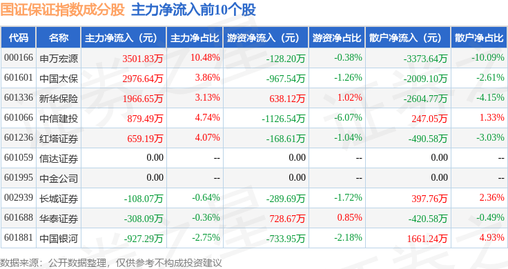 资金流向方面,国证保证(399420)指数成份股当日主力资金净流出合计10.09亿元,游资资金净流入合计4.15亿元,散户资金净流入合计5.95亿元。成份股资金流向详情见下表: