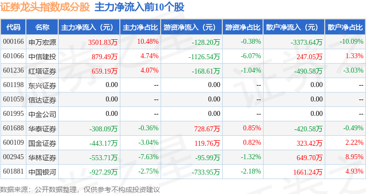 资金流向方面,证券龙头(399437)指数成份股当日主力资金净流出合计8.71亿元,游资资金净流入合计1.76亿元,散户资金净流入合计6.95亿元。成份股资金流向详情见下表: