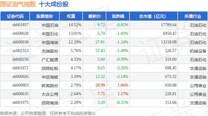 证券之星消息,11月26日,国证油气(399439)指数报收于1816.14点,跌0.89%,成交164.13亿元,换手率0.62%。当日该指数成份股中,上涨的有11家,胜利股份以6.19%的涨幅领涨,下跌的有39家,兰石重装以9.85%的跌幅领跌。