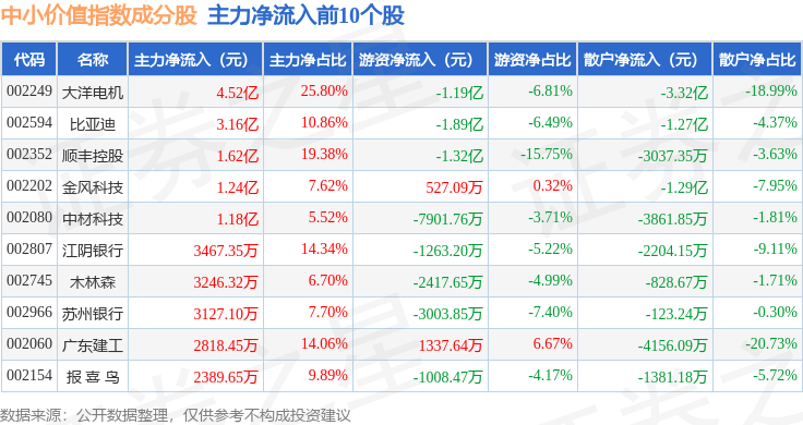 资金流向方面,中小价值(399604)指数成份股当日主力资金净流入合计3.12亿元,游资资金净流出合计2.25亿元,散户资金净流出合计8777.6万元。成份股资金流向详情见下表: