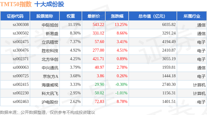 证券之星消息,11月26日,TMT50(399610)指数报收于8932.47点,涨3.63%,成交1685.57亿元,换手率1.67%。当日该指数成份股中,上涨的有31家,中际旭创以13.25%的涨幅领涨,下跌的有19家,中航光电以2.25%的跌幅领跌。