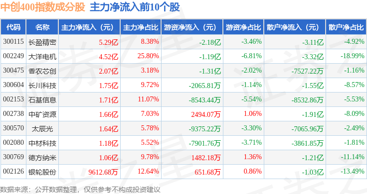资金流向方面,中创400(399624)指数成份股当日主力资金净流出合计57.9亿元,游资资金净流入合计8.41亿元,散户资金净流入合计49.49亿元。成份股资金流向详情见下表: