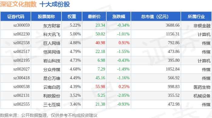 深证文化(399654)指数十大成份股详情如下: