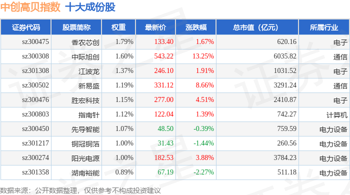 中创高贝(399666)指数十大成份股详情如下:
