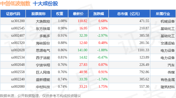 证券之星消息,11月26日,中创低波(399665)指数报收于2280.89点,跌0.11%,成交1061.74亿元,换手率1.25%。当日该指数成份股中,上涨的有73家,大洋电机以9.96%的涨幅领涨,下跌的有119家,东岳硅材以5.35%的跌幅领跌。