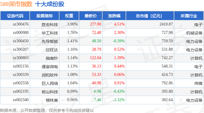 500深市(399802)指数十大成份股详情如下: