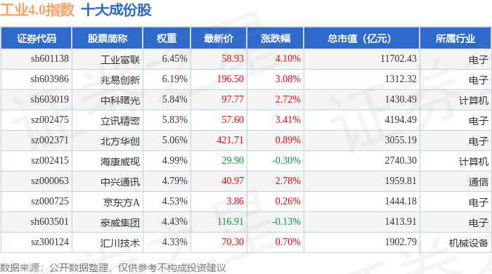 工业4.0(399803)指数十大成份股详情如下:
