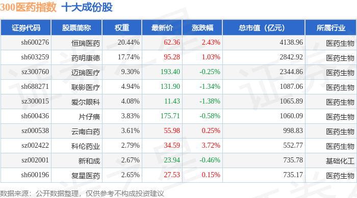 300医药(399913)指数十大成份股详情如下: