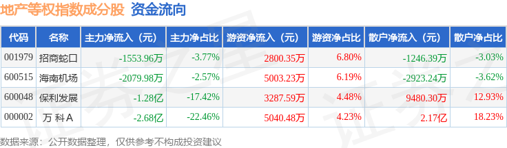资金流向方面,地产等权(399983)指数成份股当日主力资金净流出合计4.32亿元,游资资金净流入合计1.61亿元,散户资金净流入合计2.7亿元。成份股资金流向详情见下表: