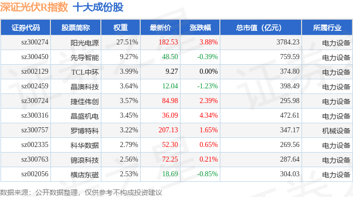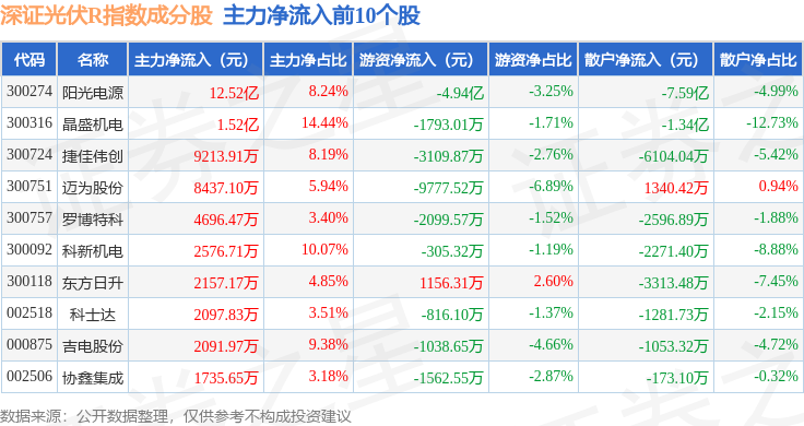 资金流向方面,深证光伏R(470035)指数成份股当日主力资金净流入合计8.94亿元,游资资金净流出合计6.01亿元,散户资金净流出合计2.93亿元。成份股资金流向详情见下表: