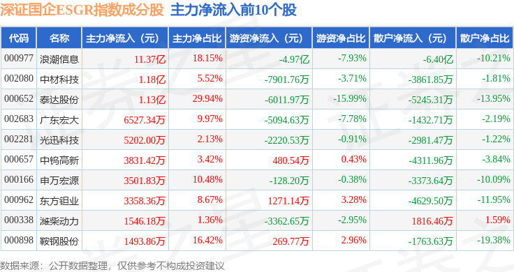 资金流向方面,深证国企ESGR(470055)指数成份股当日主力资金净流入合计8.45亿元,游资资金净流出合计4.75亿元,散户资金净流出合计3.7亿元。成份股资金流向详情见下表: