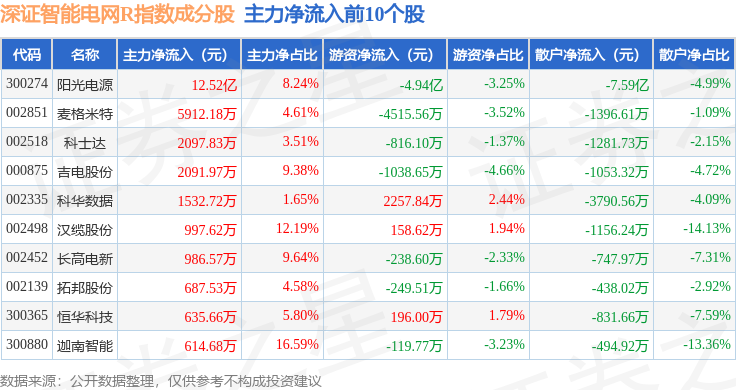 资金流向方面,深证智能电网R(470054)指数成份股当日主力资金净流入合计4.84亿元,游资资金净流出合计3.72亿元,散户资金净流出合计1.12亿元。成份股资金流向详情见下表: