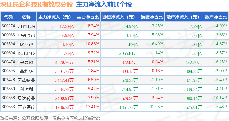 资金流向方面,深证民企科技R(470059)指数成份股当日主力资金净流入合计10.39亿元,游资资金净流出合计8.19亿元,散户资金净流出合计2.2亿元。成份股资金流向详情见下表: