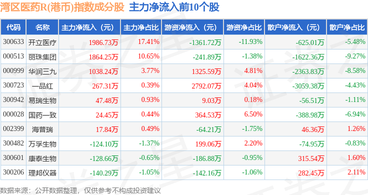 资金流向方面,湾区医药R(港币)(480014)指数成份股当日主力资金净流出合计5.58亿元,游资资金净流入合计7800.94万元,散户资金净流入合计4.8亿元。成份股资金流向详情见下表: