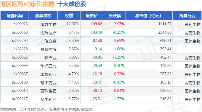湾区医药R(港币)(480014)指数十大成份股详情如下: