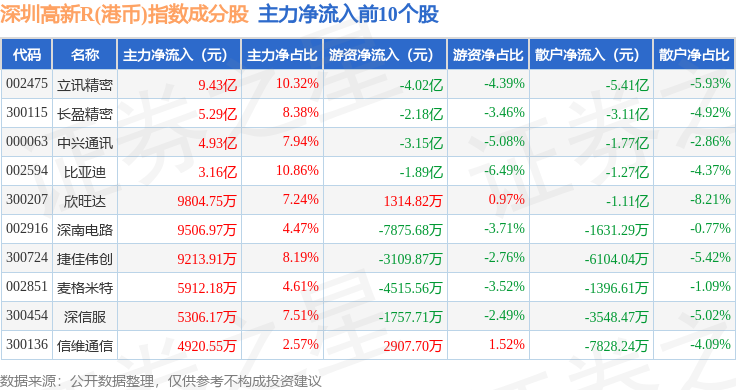 资金流向方面,深圳高新R(港币)(480039)指数成份股当日主力资金净流入合计19.42亿元,游资资金净流出合计12.82亿元,散户资金净流出合计6.61亿元。成份股资金流向详情见下表:
