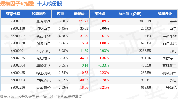 证券之星消息,11月26日,规模因子R(480055)指数报收于2256.18点,涨0.53%,成交379.39亿元,换手率1.18%。当日该指数成份股中,上涨的有21家,迈为股份以12.75%的涨幅领涨,下跌的有27家,上能电气以5.36%的跌幅领跌。