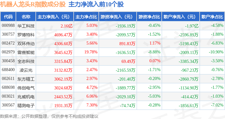 资金流向方面,机器人龙头R(480071)指数成份股当日主力资金净流出合计4.33亿元,游资资金净流入合计1.01亿元,散户资金净流入合计3.32亿元。成份股资金流向详情见下表: