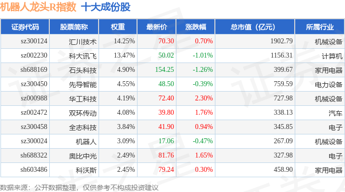 证券之星消息,11月26日,机器人龙头R(480071)指数报收于2517.83点,涨0.09%,成交268.28亿元,换手率1.84%。当日该指数成份股中,上涨的有30家,伟创电气以6.17%的涨幅领涨,下跌的有20家,海目星以4.85%的跌幅领跌。