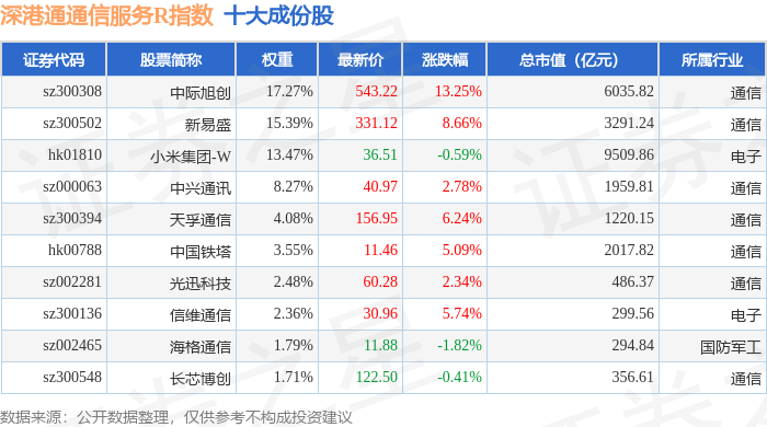 深港通通信服务R(483033)指数十大成份股详情如下: