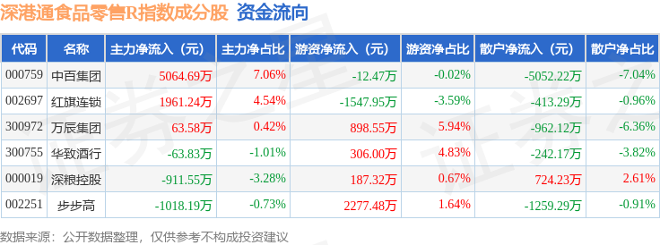 资金流向方面,深港通食品零售R(483037)指数成份股当日主力资金净流入合计5095.94万元,游资资金净流入合计2108.93万元,散户资金净流出合计7204.87万元。成份股资金流向详情见下表: