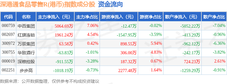 资金流向方面,深港通食品零售R(港币)(483038)指数成份股当日主力资金净流入合计5095.94万元,游资资金净流入合计2108.93万元,散户资金净流出合计7204.87万元。成份股资金流向详情见下表: