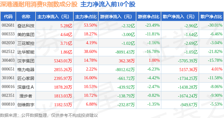 资金流向方面,深港通耐用消费R(483049)指数成份股当日主力资金净流入合计15.47亿元,游资资金净流出合计7.51亿元,散户资金净流出合计7.97亿元。成份股资金流向详情见下表: