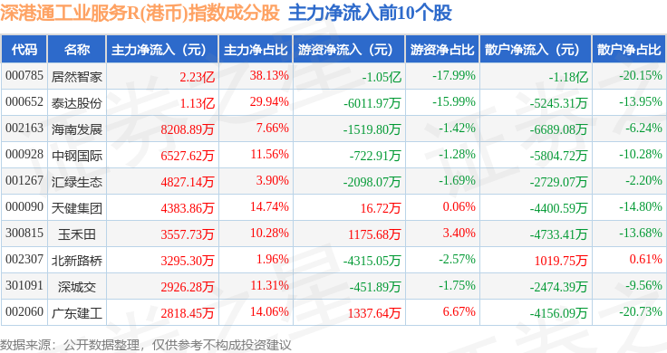 资金流向方面,深港通工业服务R(港币)(483056)指数成份股当日主力资金净流出合计4983.67万元,游资资金净流出合计2426.29万元,散户资金净流入合计7409.96万元。成份股资金流向详情见下表: