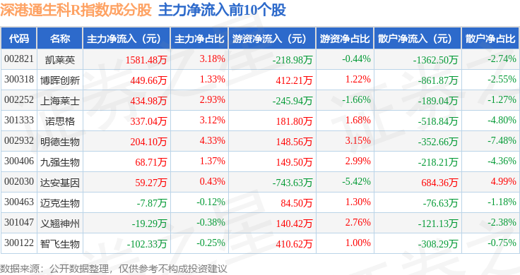 资金流向方面,深港通生科R(483059)指数成份股当日主力资金净流出合计2.64亿元,游资资金净流入合计1.05亿元,散户资金净流入合计1.59亿元。成份股资金流向详情见下表: