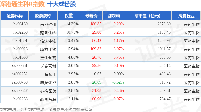 证券之星消息,11月26日,深港通生科R(483059)指数报收于7992.54点,涨0.66%,成交145.28亿元,换手率0.99%。当日该指数成份股中,上涨的有32家,荣昌生物以5.05%的涨幅领涨,下跌的有27家,万泽股份以5.11%的跌幅领跌。