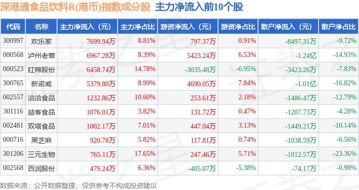 资金流向方面,深港通食品饮料R(港币)(483066)指数成份股当日主力资金净流出合计2560.9万元,游资资金净流入合计2.63亿元,散户资金净流出合计2.38亿元。成份股资金流向详情见下表: