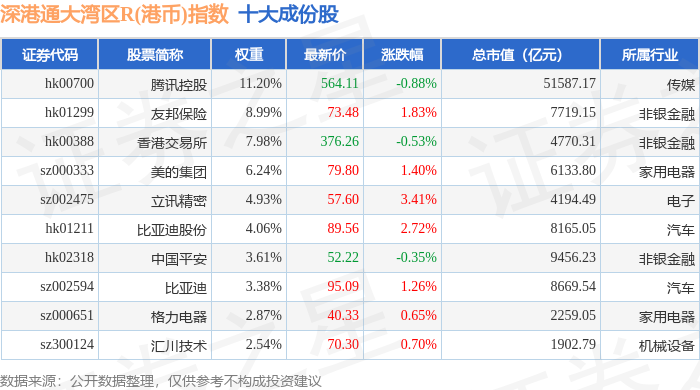 深港通大湾区R(港币)(483090)指数十大成份股详情如下: