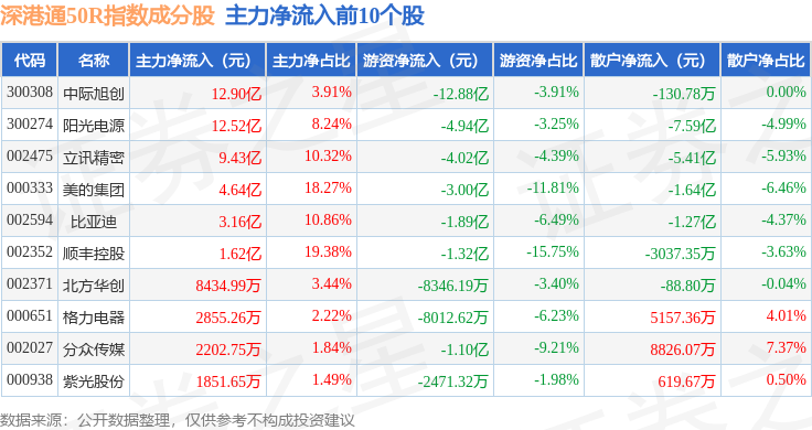 资金流向方面,深港通50R(483091)指数成份股当日主力资金净流入合计32.85亿元,游资资金净流出合计29.88亿元,散户资金净流出合计2.97亿元。成份股资金流向详情见下表: