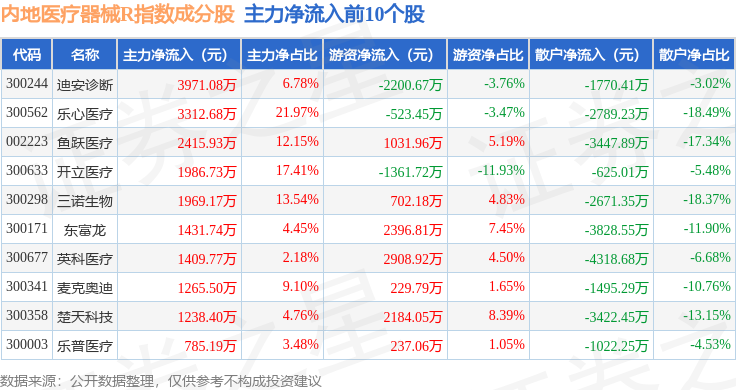 资金流向方面,内地医疗器械R(483103)指数成份股当日主力资金净流入合计1716.41万元,游资资金净流入合计5836.3万元,散户资金净流出合计7552.71万元。成份股资金流向详情见下表: