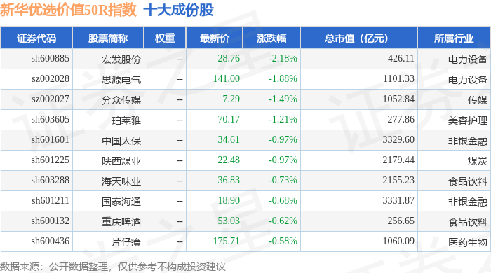 新华优选价值50R(489004)指数十大成份股详情如下: