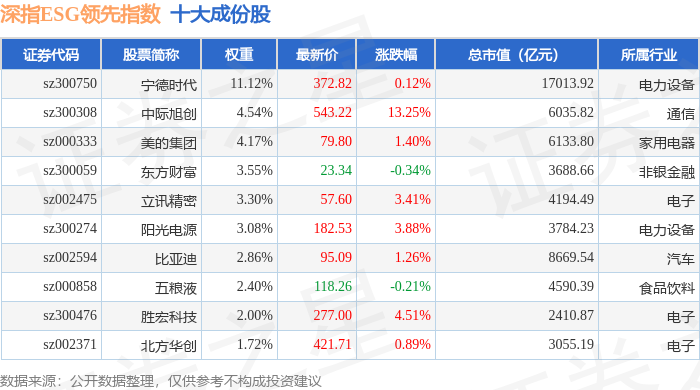深指ESG领先(970029)指数十大成份股详情如下: