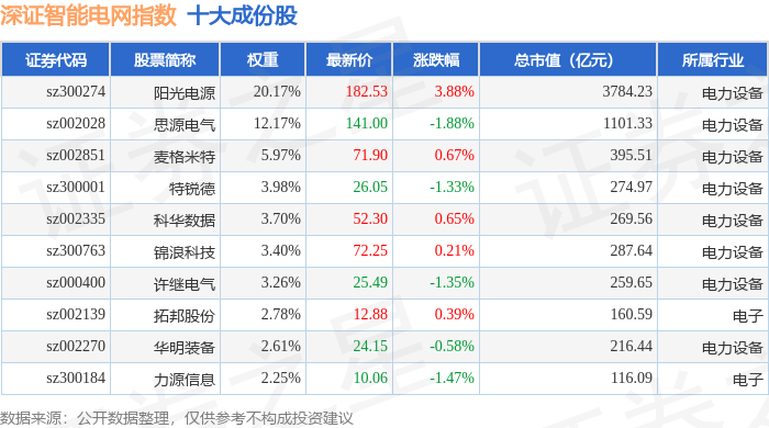 证券之星消息,11月26日,深证智能电网(970054)指数报收于3801.44点,涨0.07%,成交317.06亿元,换手率2.81%。当日该指数成份股中,上涨的有11家,电科院以7.77%的涨幅领涨,下跌的有39家,双杰电气以5.97%的跌幅领跌。