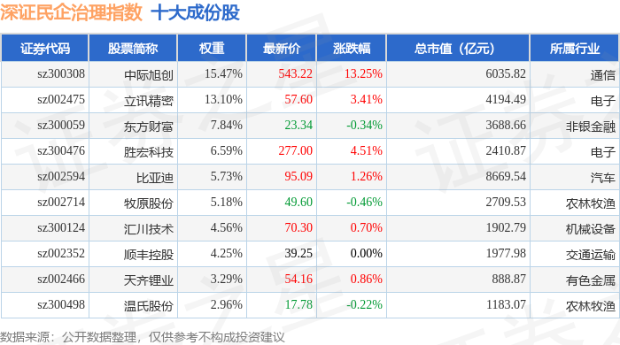 证券之星消息,11月26日,深证民企治理(970058)指数报收于1950.94点,涨3.29%,成交1284.81亿元,换手率1.8%。当日该指数成份股中,上涨的有25家,中际旭创以13.25%的涨幅领涨,下跌的有23家,东方雨虹以4.91%的跌幅领跌。