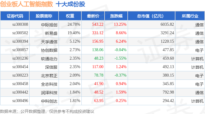 证券之星消息,11月26日,创业板人工智能(970070)指数报收于5297.73点,涨5.13%,成交1289.05亿元,换手率6.65%。当日该指数成份股中,上涨的有19家,中际旭创以13.25%的涨幅领涨,下跌的有31家,神州泰岳以2.92%的跌幅领跌。