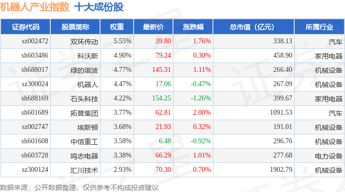 资金流向方面,机器人产业(980022)指数成份股当日主力资金净流出合计1.42亿元,游资资金净流出合计8262.24万元,散户资金净流入合计2.27亿元。成份股资金流向详情见下表:
