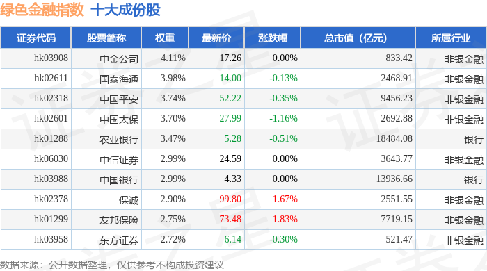 资金流向方面,绿色金融(980052)指数成份股当日主力资金净流出合计1.33亿元,游资资金净流出合计1.04亿元,散户资金净流入合计2.38亿元。成份股资金流向详情见下表: