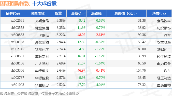 证券之星消息,11月26日,国证回购(980063)指数报收于3254.76点,跌0.31%,成交106.77亿元,换手率1.29%。当日该指数成份股中,上涨的有21家,中恒集团以10.07%的涨幅领涨,下跌的有26家,万泽股份以5.11%的跌幅领跌。