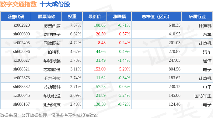 证券之星消息,11月26日,数字交通(980075)指数报收于3043.09点,跌1.01%,成交241.61亿元,换手率2.09%。当日该指数成份股中,上涨的有13家,芯原股份以5.29%的涨幅领涨,下跌的有37家,晨曦航空以11.35%的跌幅领跌。