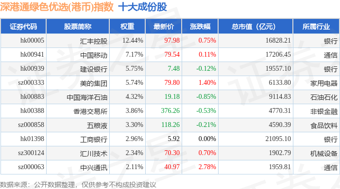 深港通绿色优选(港币)(983012)指数十大成份股详情如下: