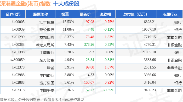 深港通金融(港币)(983026)指数十大成份股详情如下: