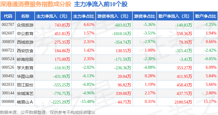 资金流向方面,深港通消费服务(983045)指数成份股当日主力资金净流出合计4.88亿元,游资资金净流入合计6608.91万元,散户资金净流入合计4.22亿元。成份股资金流向详情见下表: