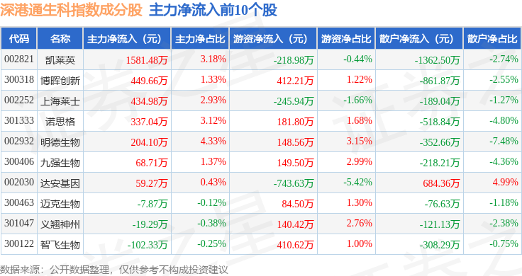 资金流向方面,深港通生科(983059)指数成份股当日主力资金净流出合计2.64亿元,游资资金净流入合计1.05亿元,散户资金净流入合计1.59亿元。成份股资金流向详情见下表: