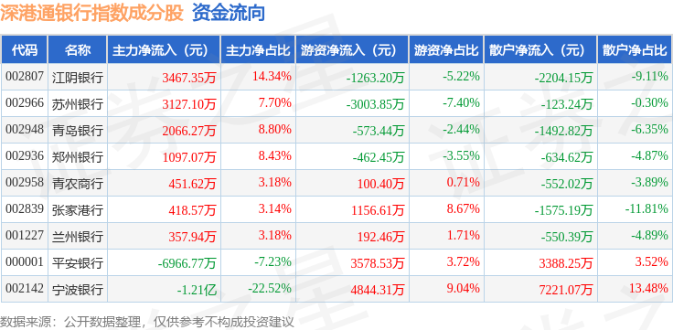 资金流向方面,深港通银行(983081)指数成份股当日主力资金净流出合计8046.25万元,游资资金净流入合计4569.37万元,散户资金净流入合计3476.88万元。成份股资金流向详情见下表: