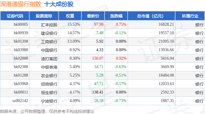 证券之星消息,11月26日,深港通银行(983081)指数报收于7681.48点,跌0.23%,成交80.19亿元,换手率0.16%。当日该指数成份股中,上涨的有12家,中国光大银行以1.34%的涨幅领涨,下跌的有12家,青岛银行以1.74%的跌幅领跌。